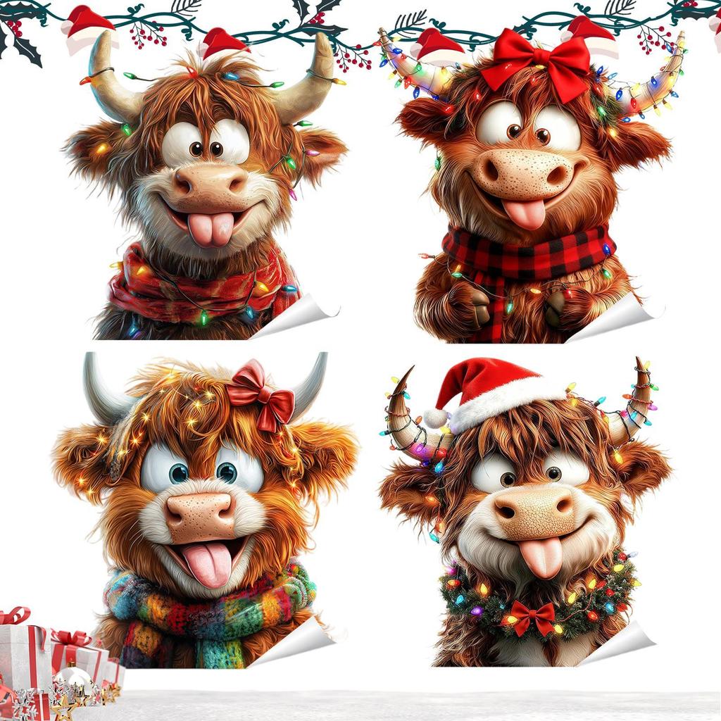 4pcs Christmas Window Decals Cute Highland Cow Static Transparent Glass Stickers Electrostatic Adhesion Glass Door Holiday Decal