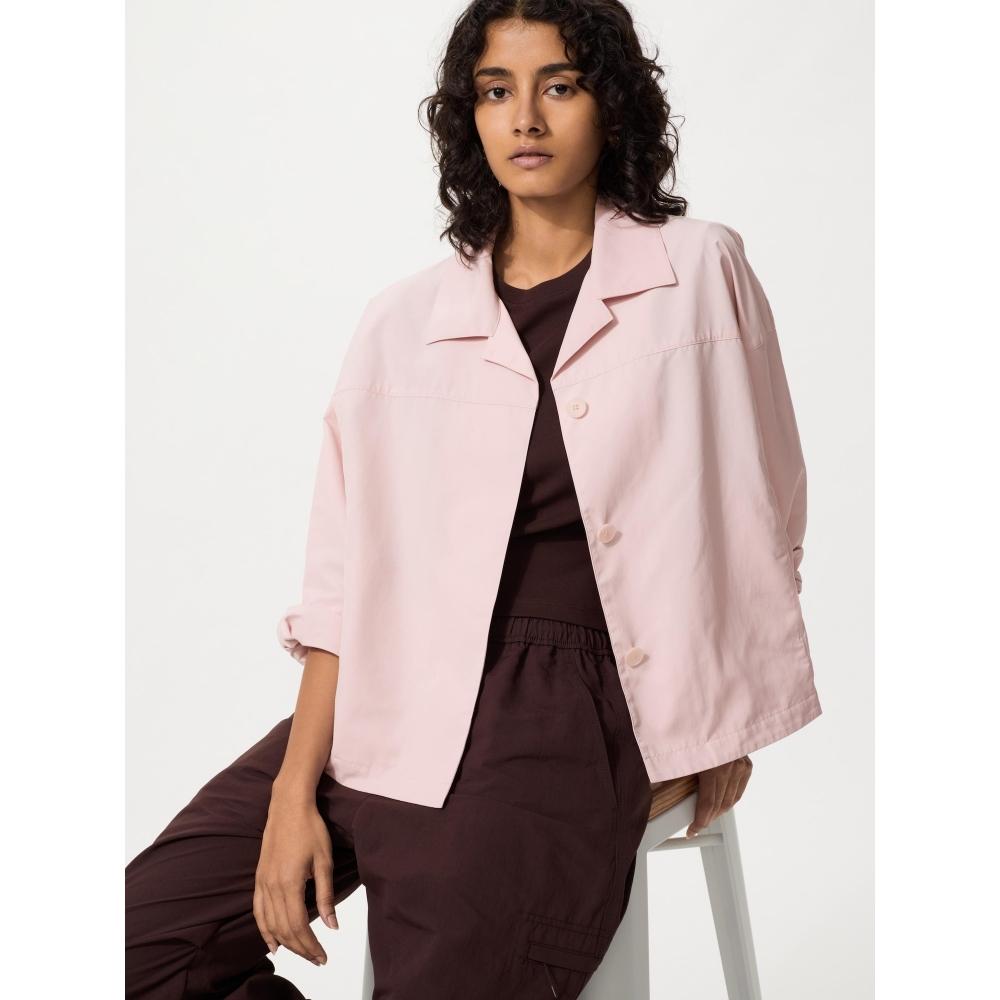 Укороченная куртка UNIQLO Japan с отложным воротником сочетает в себе легкость, комфорт и стиль.. Его свободный крой и карманы обеспечивают практичный дизайн, подходящий для различных нижних частей одежды.