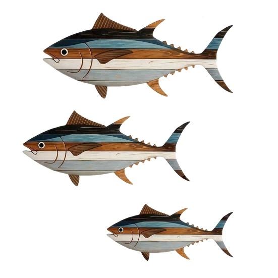 Уникальный трехкомпонентный дизайн Этот набор включает три разных подвески в виде рыб на морскую тематику, каждая из которых выполнена в деревенской, разноцветной палитре. Их разнообразные формы и цвета добавляют глубину и визуальный интерес, делая их выдающимся декоративным элементом, который отражает суть жизни у моря.