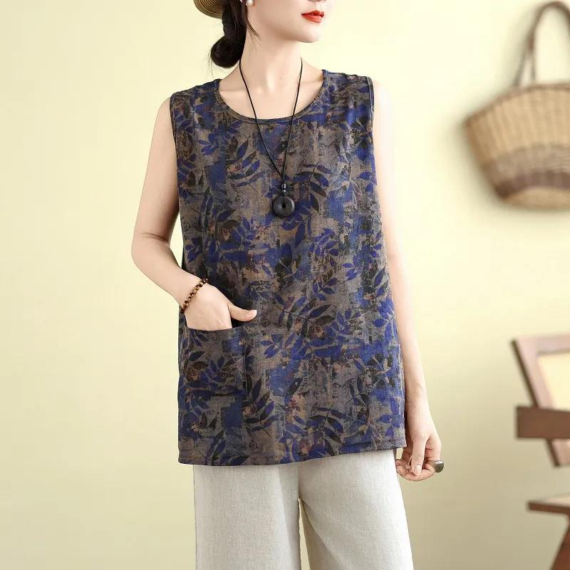 Литературный Ретро Цветная Майка Летняя Новая Повседневная Свободная Универсальная Хлопок и Лен Мамин Топ Без Рукавов