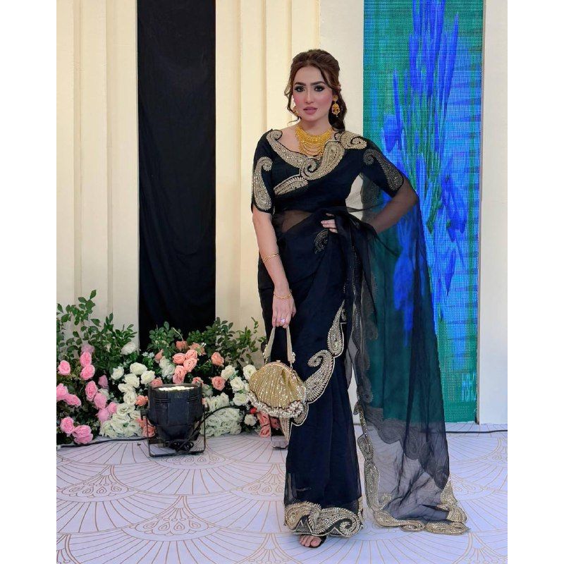 2)Ткань сари : Премиальный шелк Ранголи с паллу, украшенным нитью джари, и вышивкой пайетками 3 мм