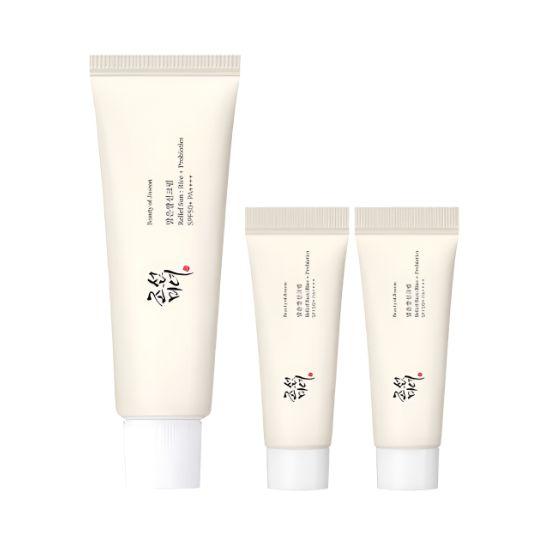 Beauty of Joseon Relief Sun Rice + Probiotics Sunscreen is a moisturizing daily sunscreen that protects the skin while keeping it hydrated and comfortable. Enriched with rice extract and probiotics, it helps nourish the skin and support a healthy skin barrier. The lightweight creamy texture blends smoothly without white cast or stickiness, making it perfect under makeup. This special set includes two 10ml mini sunscreens, ideal for travel or convenient reapplication.