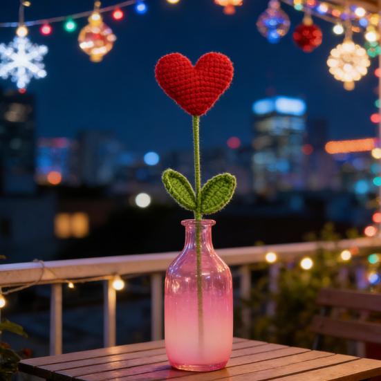 This hand-crocheted heart stem features a delicate, visible stitch texture that highlights exquisite craftsmanship and a warm handmade feel. The bright green woolen stem and two symmetrically arranged leaves create a natural, vivid appearance with a slender, straight design. The vibrant red heart-shaped flower symbolizes love and romance, offering a unique and emotionally meaningful shape.