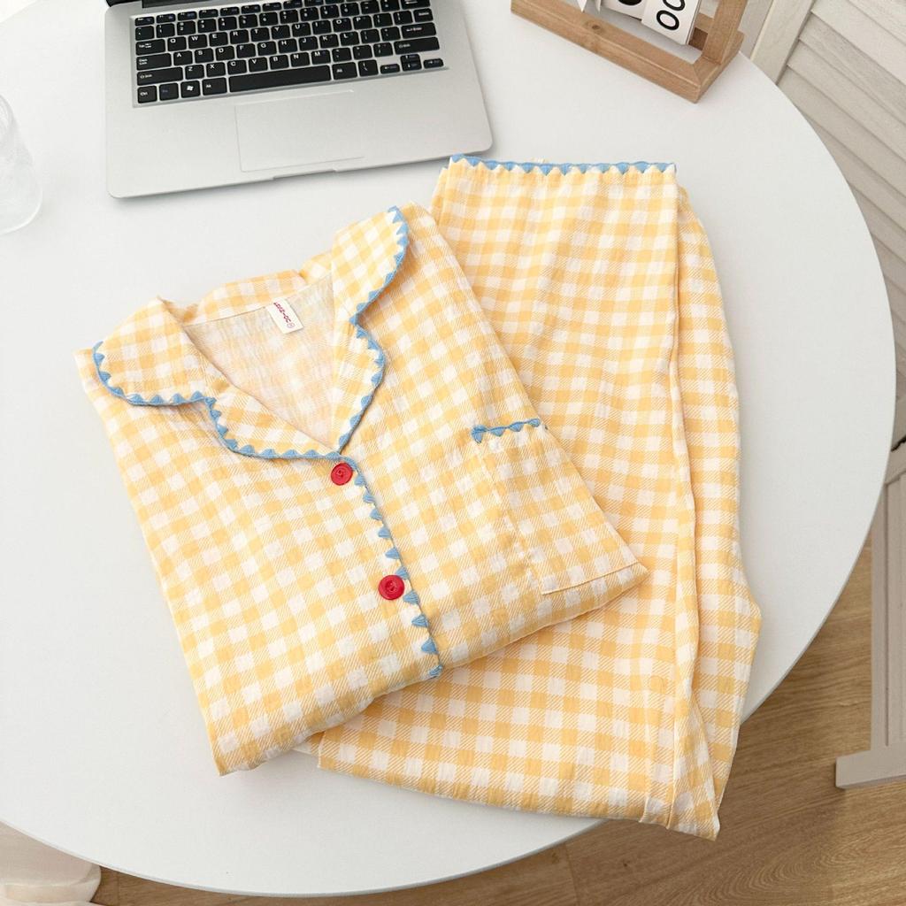 Yellow Plaid Shell-Edged Cloud Cotton Pajama Set for Women - Long Sleeve, Spring/Autumn Homewear with High-End Feel. — купить товар онлайн с бесплатной доставкой по всему миру!