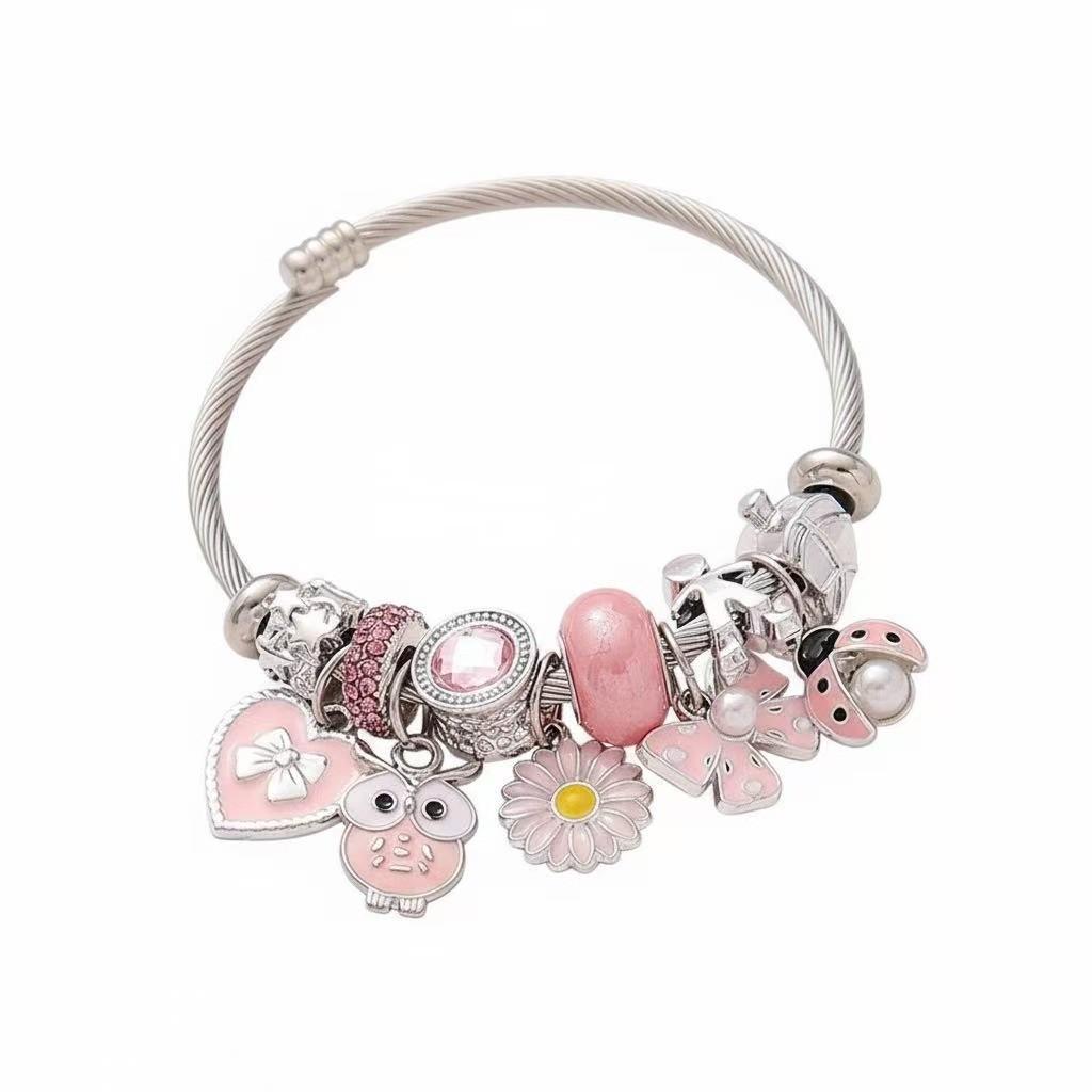 This DIY bracelet features a stainless steel construction with an electroplated finish, offering durability and a stylish appearance, making it comfortable for everyday wear. The design incorporates charming animal motifs such as owls and ladybugs, perfect for summer fashion.