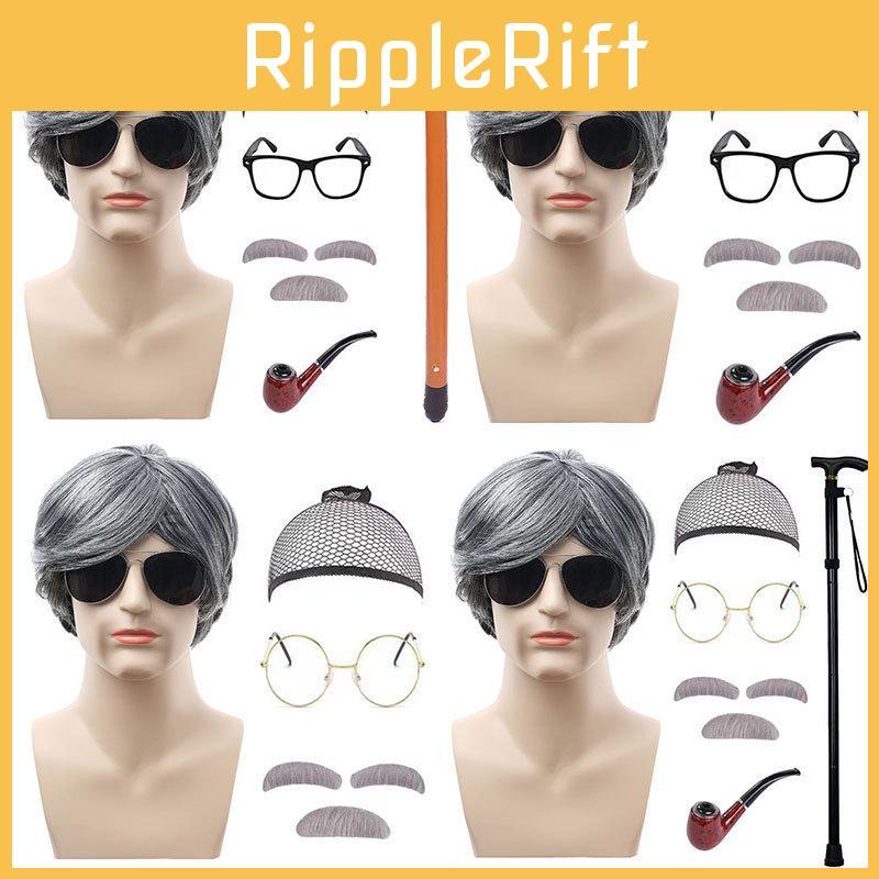 Полное преображение дедушки: Этот костюмный набор включает серый парик, бороду и дополнительные аксессуары, такие как очки и трость, для обеспечения завершенного образа старика на Хэллоуин или косплей-мероприятиях.