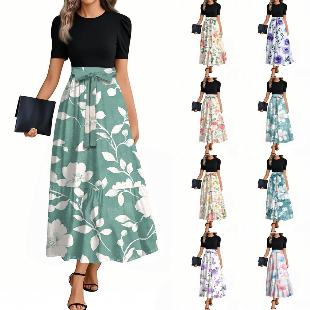Женское элегантное модное повседневное платье с цветочным принтом и поясом, короткими рукавами и круглым вырезом — купить товар онлайн с бесплатной доставкой по всему миру!