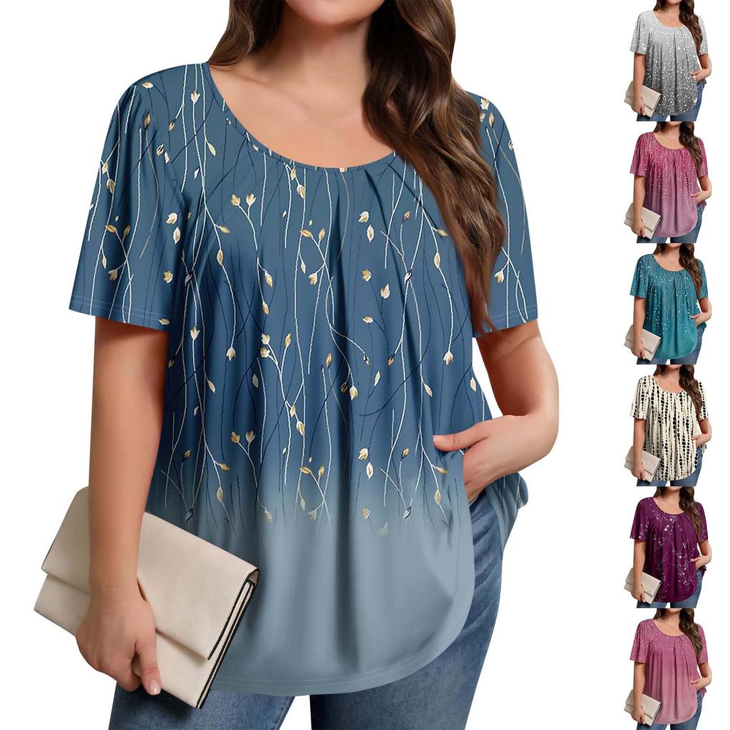 Plus Size Women's Casual Round Neck Pleated Short Sleeve Color Top