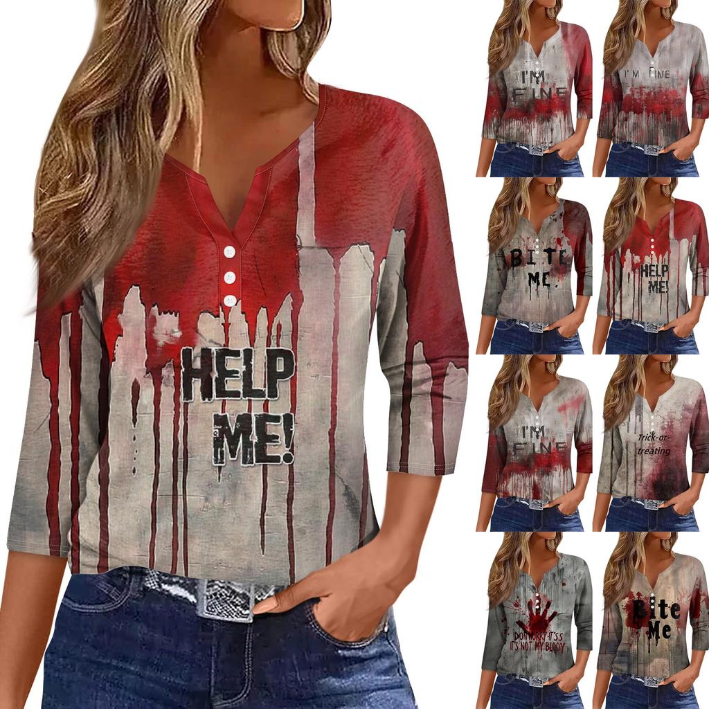 Женская модная повседневная футболка с принтом на Хэллоуин, V-образным вырезом, короткими рукавами, декоративными пуговицами и рукавами три четверти — купить товар онлайн с бесплатной доставкой по всему миру!