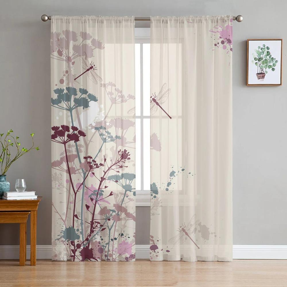 Watercolor Flowers Dragonfly Art Drapes for Living Room Bedroom Decor Transparent Chiffon Sheer Window Curtain