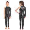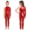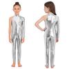 Девочки Сценический комбинезон: Асимметричный металлический боди с воротником-стойкой, сетчатой вставкой на спине, скрытой молнией, одежда для танцев