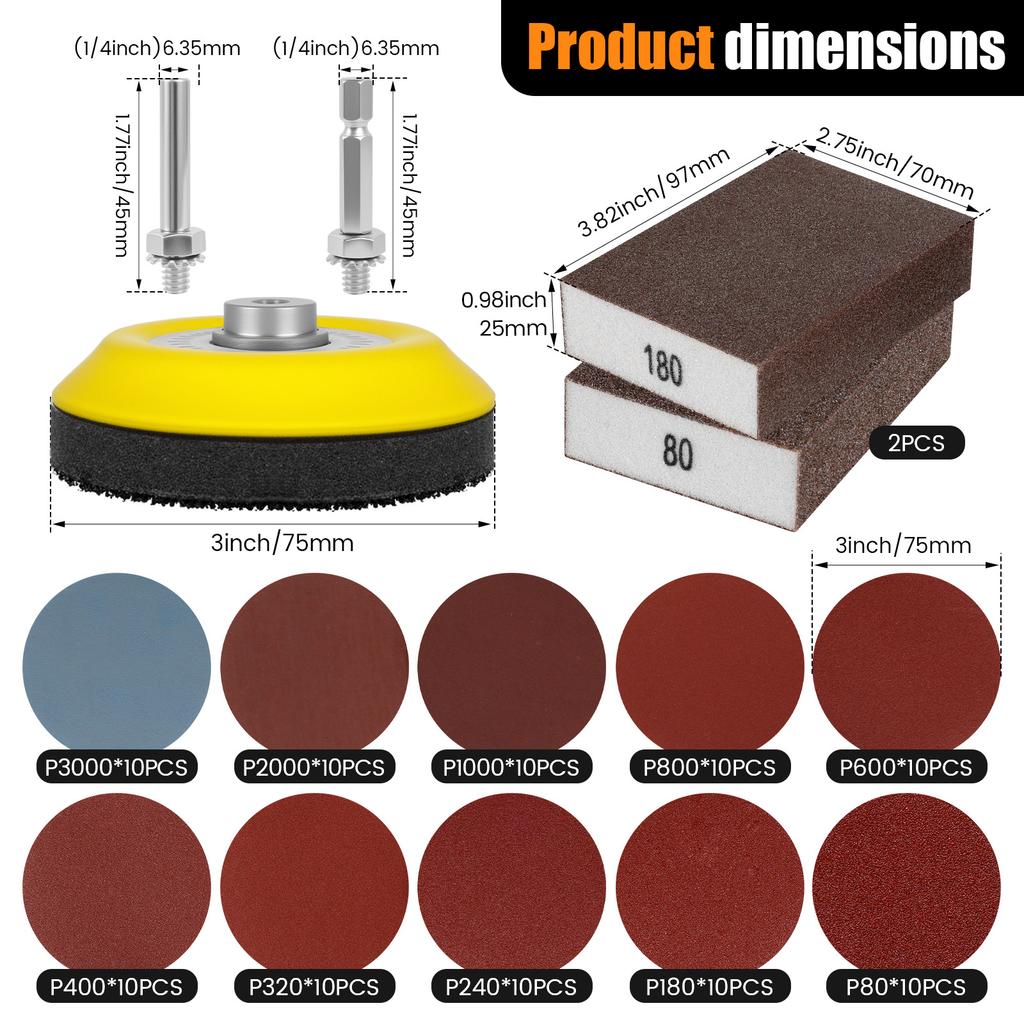 100 шт. 3 дюйма 75 мм шлифовальных дисков с подложкой и 2 шт. шлифовальных губок-полировальных блоков, зернистость 80-3000, для дрели, шлифмашинки, вращающихся инструментов, насадка