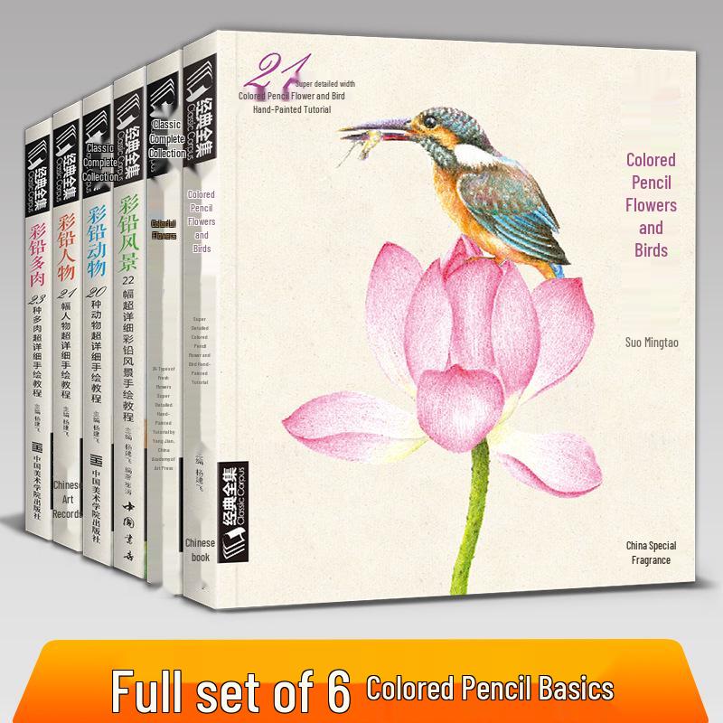 Классический набор цветных карандашей: 6 книг - Птицы, Цветы, Фигуры, Суккуленты, Пейзажи, Животные для начинающих