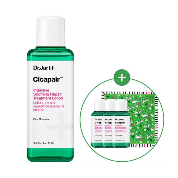 Calm and restore sensitive skin with Dr.Jart+ Cicapair Intensive Soothing Repair Treatment Lotion. Infused with Centella Asiatica, this lightweight yet nourishing formula helps reduce irritation while strengthening the skin barrier. It delivers deep hydration and promotes a healthier, balanced complexion. This set includes travel-size lotions and a tiger grass-inspired accessory for added value.