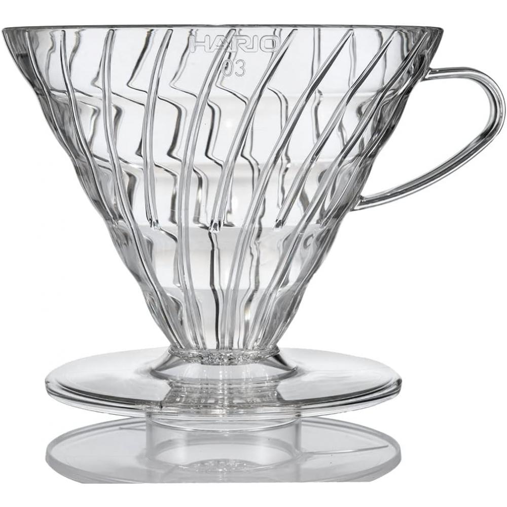 The HARIO V60 Transparent Dripper 03 Clear is a high-quality coffee hand drip tool manufactured in Japan. This dripper is designed for 1-6 cups and features a unique conical shape that helps optimize the coffee's flavor for a deep extraction. The large hole in the dripper allows you to adjust the flow rate of water, enabling you to experience various flavors.