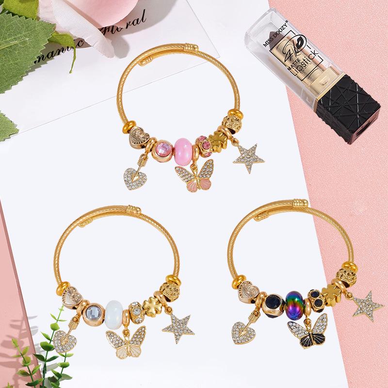 Браслет-бангл из нержавеющей стали с тематикой Ветра, Алмазным Сердцем и бусинами, с подвесками-бабочками и звездами, для девочек