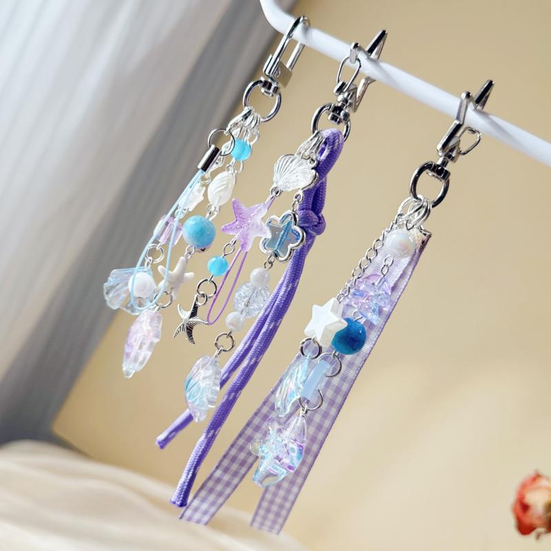 Sweet Purple Shell Star Dolphin Keyring Beaded Keychain Phone Chain Backpack Bag Pendant Charm Car Key Decoration Accessories