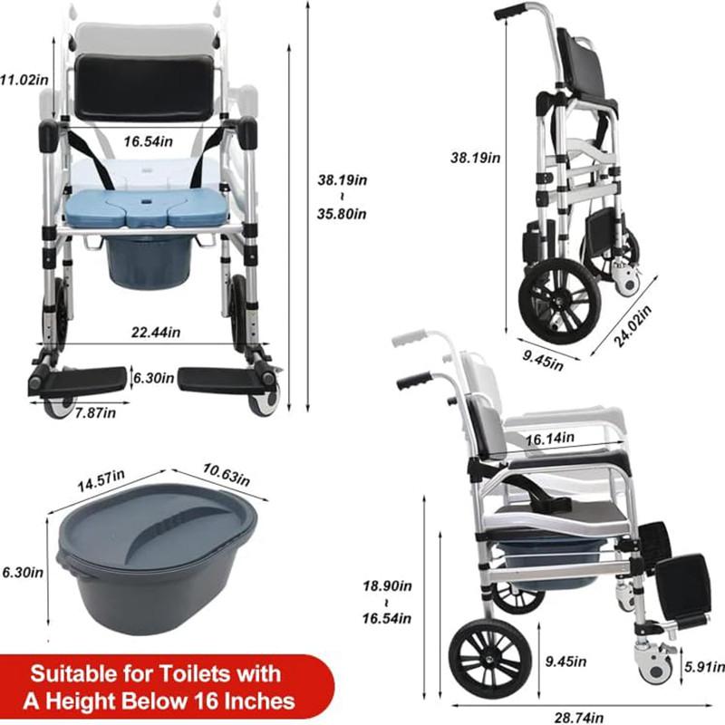 【Широкий спектр применения】: Наш душевой стул на колесах универсален и подходит для решения проблем пожилых людей при использовании туалета или душа.. Вы можете поставить нашу душевую коляску рядом с кроватью в качестве прикроватного туалета.. Или может быть установлен прямо над унитазом. Используйте его как транспортную коляску, чтобы расширить диапазон движений пользователя