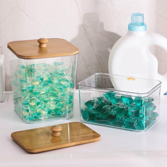 Изготовлен из высококачественного акрила, он прочный, ударопрочный и долговечный.. Гладкая поверхность препятствует скоплению грязи; Любой пролитый моющий раствор легко вытирается влажной тряпкой, а бамбуковую крышку также можно регулярно чистить.. Поставьте его рядом со стиральной машиной, под раковиной или на открытую полку, превратив само хранение в часть эстетики вашего дома.
