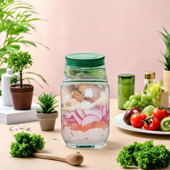 Изготовленная из высококачественных материалов, не содержащих бисфенол А, эта банка безопасна и пригодна для повторного использования.. Удобная для путешествий конструкция исключает протечки и идеально подходит для приготовления блюд на ходу, например, мюсли или салатов с пастой.. Наслаждайтесь свежими салатами без хлопот с нашей инновационной салатницей!