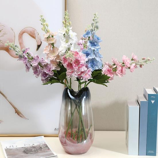Delicately layered petals with soft color gradients, downy buds, and emerald green leaves replicate the natural elegance of real delphiniums. Ideal for living rooms, hotel lobbies, weddings, photo studios, and events, their gentle purple and pink hues complement Chinese, Nordic, and other decor styles.