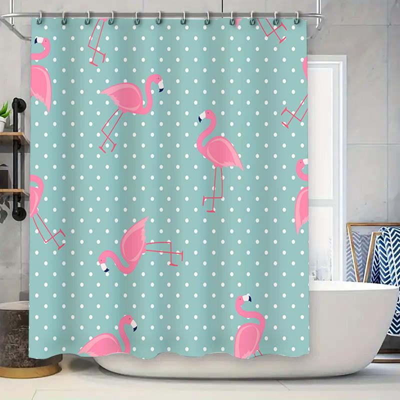 Vintage Flamingo Print Shower Curtain for Bathroom Decor Mint Green with White Polka Dots Pink Birds Pattern 180x245cm Bath Fabr