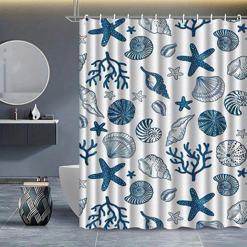 Mediterranean Coastal Shower Curtain with Hooks - Machine Washable Polyester Bathroom Decor, Artistic Starfish & Seashell Design