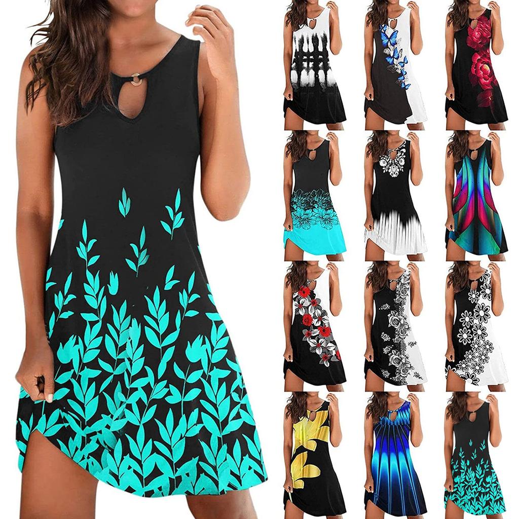Fashion Women Summer Print Hollow Out Sleeveless Loose Mid Dresses