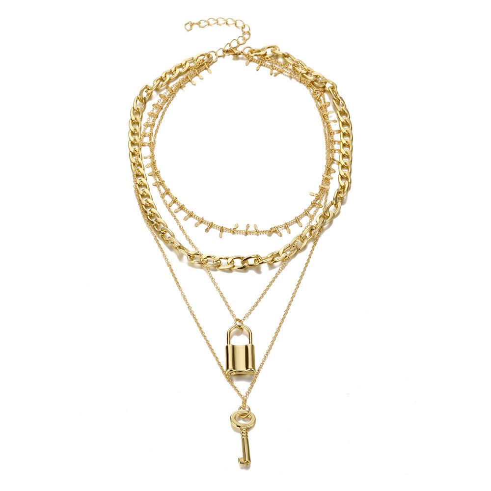 Introducing our Fashionable Layered Key Lock Necklace, a stunning accessory that perfectly blends modern elegance with a touch of playful charm. This eye-catching piece showcases a unique geometric design, making it a standout addition to any jewelry collection. Crafted from high-quality alloy and featuring an exquisite electroplated finish, this necklace radiates a luxurious gold hue that effortlessly complements a variety of outfits, from casual daywear to sophisticated evening attire.