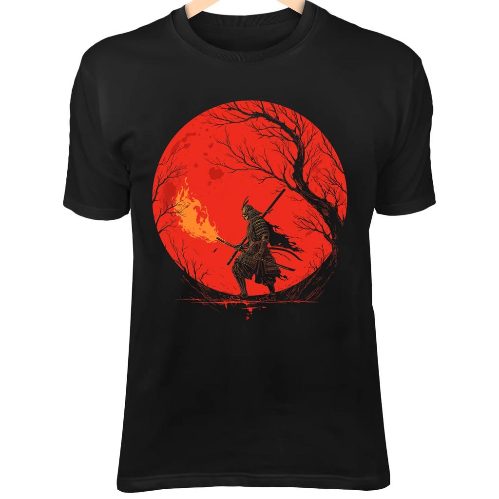 Футболка «Череп самурая» – Пламенеющий катана, Полная луна, Развевающийся на ветру плащ Арт