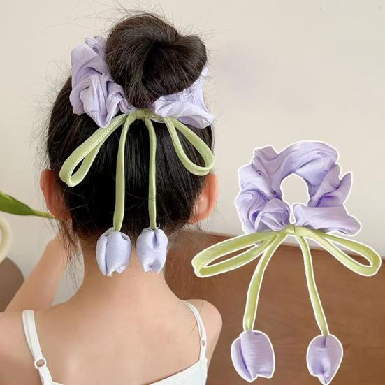 Нежная форма тюльпана сочетает объемные плиссированные цветы со свежими зелеными лентами-ленточками, создавая мягкий, очаровательный образ, идеально подходящий для девочек.. Универсален для пучков, высоких хвостов или причесок полу-собранных, подходит для повседневной носки, школы, путешествий, фотосессий и выступлений..