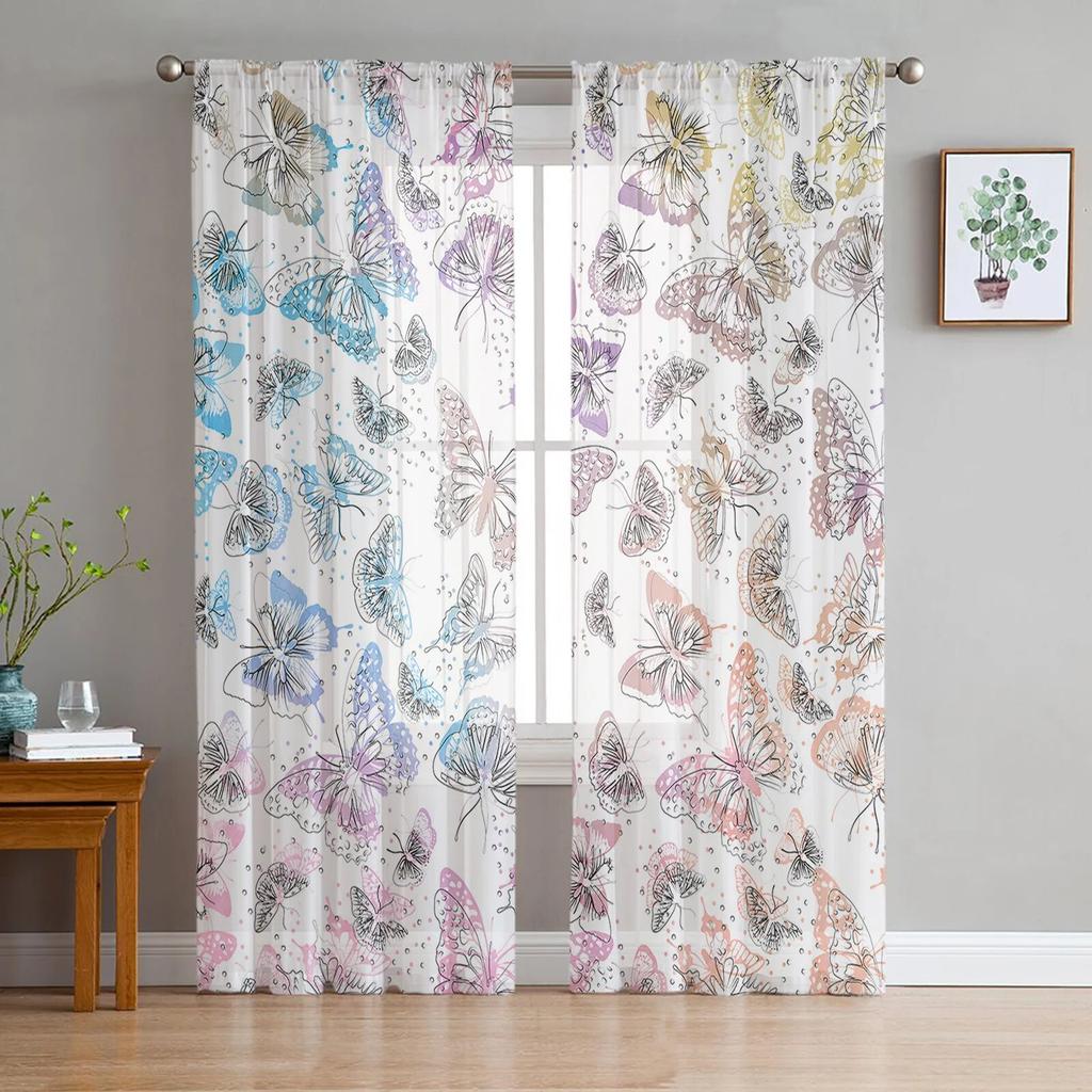 Spring Butterfly Hand-painted Watercolor Sheer Curtains Elegant Voile Tulle for Bedroom Window Holiday Decoration