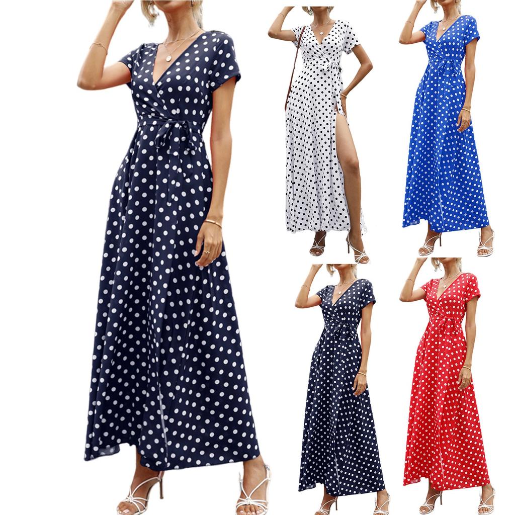 Женские платья повседневные элегантные с завышенной талией в горошек с разрезом V-образным вырезом и коротким рукавом