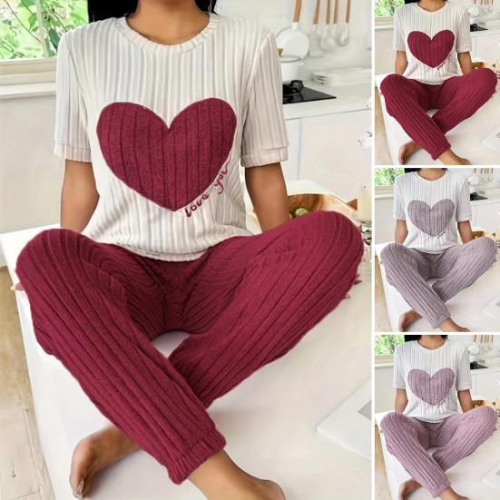 Этот модный пижамный комплект для женщин отличается свободным и повседневным кроем, подходит для всех типов телосложения и возрастов.. Верх украшен стильным украшением в виде сердца, которое сочетается с цветом брюк, что добавляет милую нотку всему ансамблю..