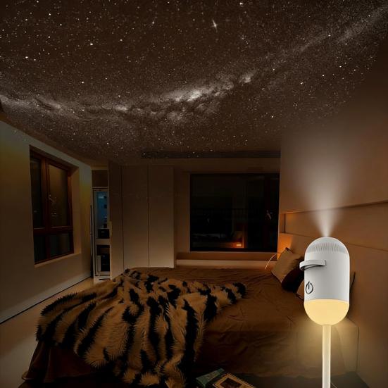 Универсальная функциональность 2-в-1: Сочетая завораживающий проектор звездного неба с успокаивающим ночником, это компактное устройство превращает любое пространство в сказочное убежище или уютное святилище.. Идеально подходит для спален, детских комнат или зон отдыха, повышает комфорт и атмосферу, способствуя спокойному сну и созданию умиротворяющей обстановки.