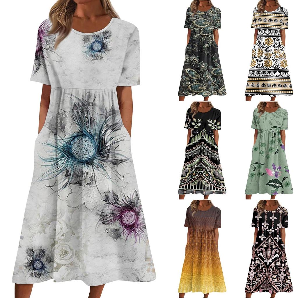 Жен. Повседневные платья Платья с принтами Летние платья С принтами Плиссированные платья-миди с круглым вырезом Классический Классический На открытом воздухе Повседневные С короткими рукавами Свободные платья — купить товар онлайн с бесплатной доставкой по всему миру!
